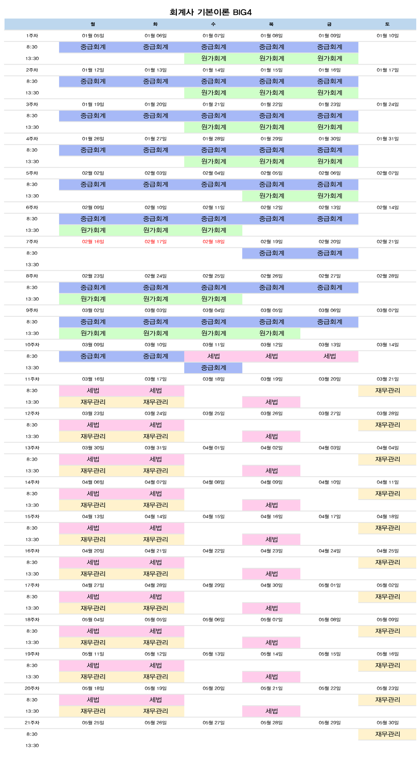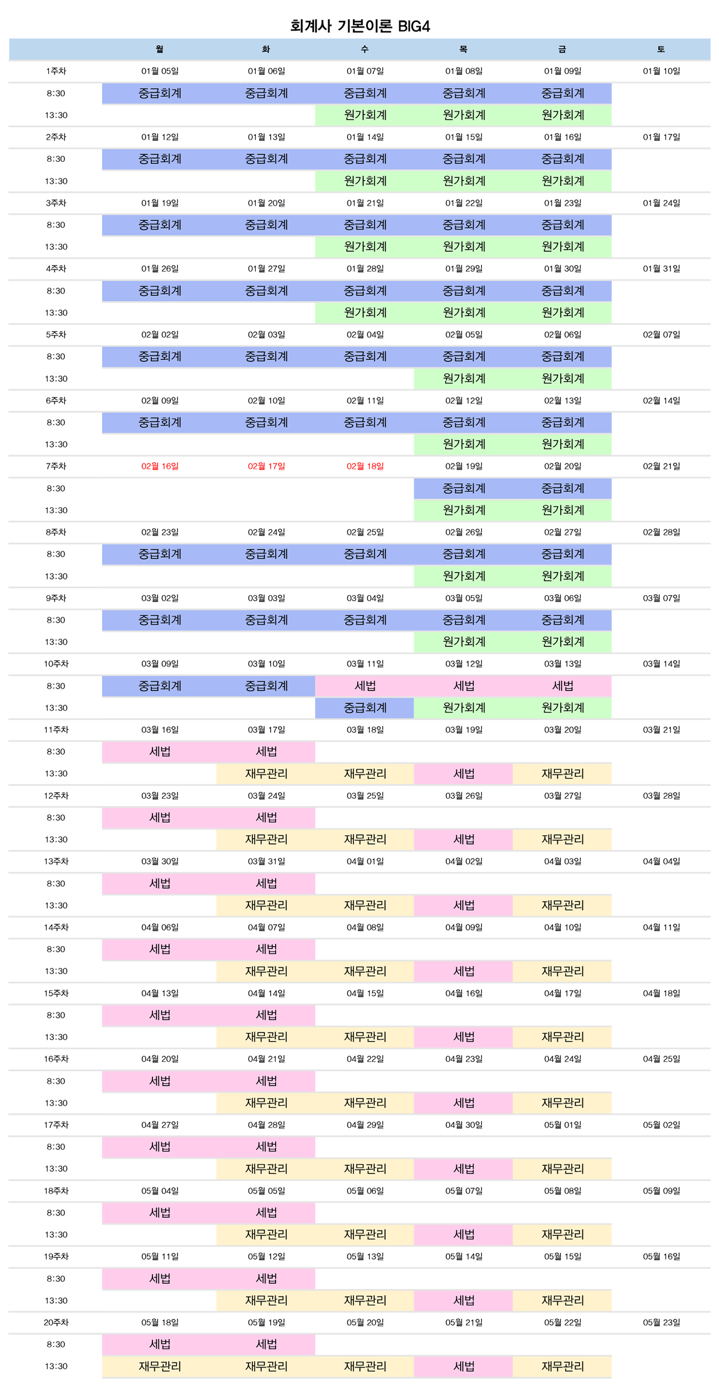2027년 대비 회계사 기본이론 BIG4 종합반 시간표입니다