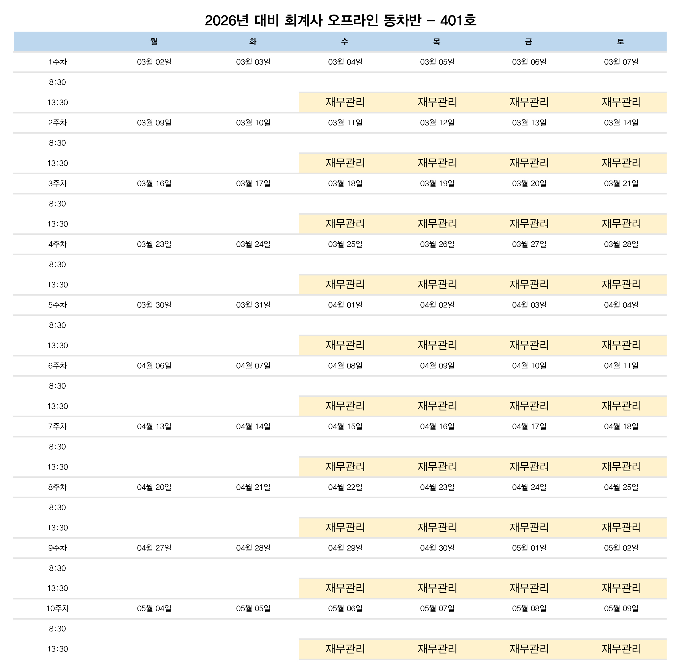 2026년 대비 회계사 오프라인 동차반 시간표 안내